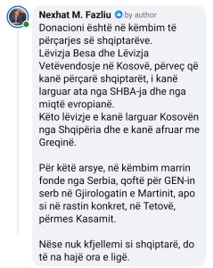 Sipas Fazliut, ky donacion nuk është i rastësishëm, por pjesë e një agjende më të gjerë politike që synon afrimin e disa partive shqiptare me Serbinë dhe Greqinë, në dëm të interesit kombëtar.
